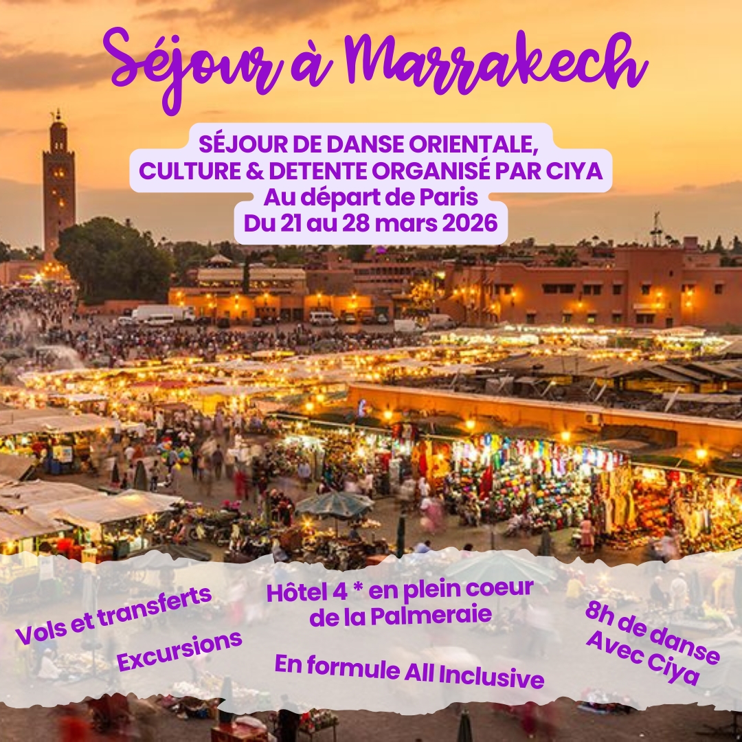 en formule tout inclus dans un superbe hôtel 4 étoiles de la Palmeraie, stages de danse. Tarif : 1300 € tout compris (Possibilité de règlement échelonné - places limitées) Ce voyage est une belle occasion de vivre une expérience unique, de progresser en danse, de s'évader, et surtout de partager de merveilleux moments, entre femmes passionnées. Les inscriptions sont ouvertes dès maintenant ! Envoyez-moi un mail à ciyadanse@live.fr pour recevoir la brochure !